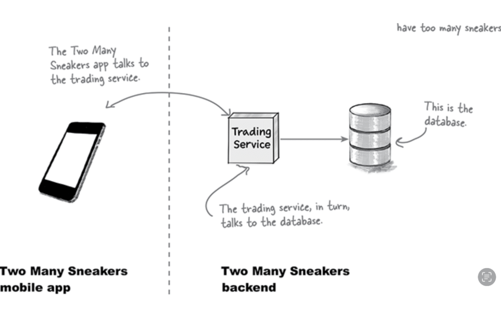 اپلیکیشن Two Many Sneakers میدونه چطور با سرویس معامله ارتباط برقرار کنه تا اطلاعات رو دریافت یا بهروزرسانی کنه—مثلاً عکس یه جفت نایک نو و دستنخورده. سرویس معامله هم به نوبهی خودش اطلاعات رو از دیتابیس میگیره و اون رو آپدیت میکنه.