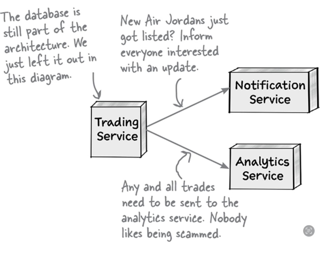 الان معماری سیستم خیلی سادهست—سرویس معامله فقط با دیتابیس خودش حرف میزنه، همین. حالا باید کاری کنیم که این سرویس بتونه اطلاعات رو به سرویس نوتیفیکیشن و سرویس تحلیل داده هم بفرسته.