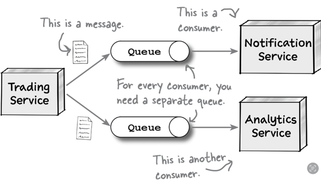 مثلاً اگه سرویس معامله بخواد اطلاعات معاملات رو هم به سرویس تحلیل و هم به سرویس گزارشگیری بفرسته، باید برای هر کدوم یه صف جدا داشته باشه.