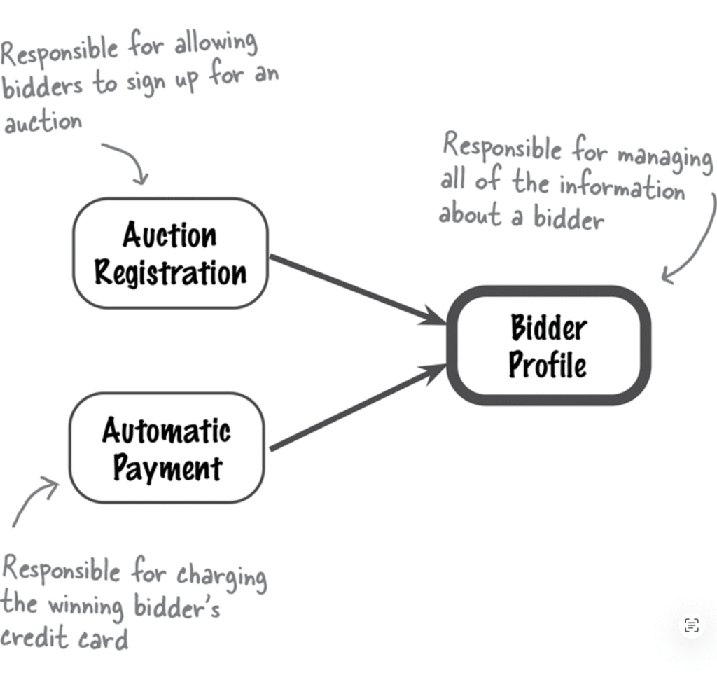 - میتونی از رویکرد جریان کاری (workflow) برای شناسایی کامپوننتهای منطقی اولیه استفاده کنی—با تخصیص مراحل داستان اصلی مشتری به کامپوننتها.