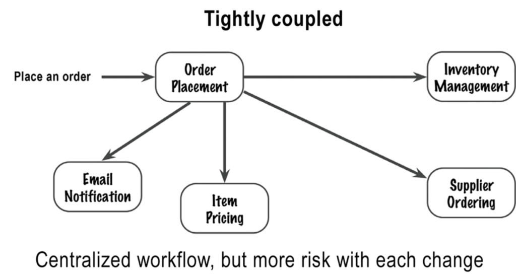 در معماری با اتصال شدید (Tightly Coupled)، اگه بخوای بفهمی وقتی مشتری سفارشی ثبت میکنه چه اتفاقی میافته، فقط کافیه به کامپوننت Order Placement نگاه کنی تا کل جریان کاری رو ببینی.