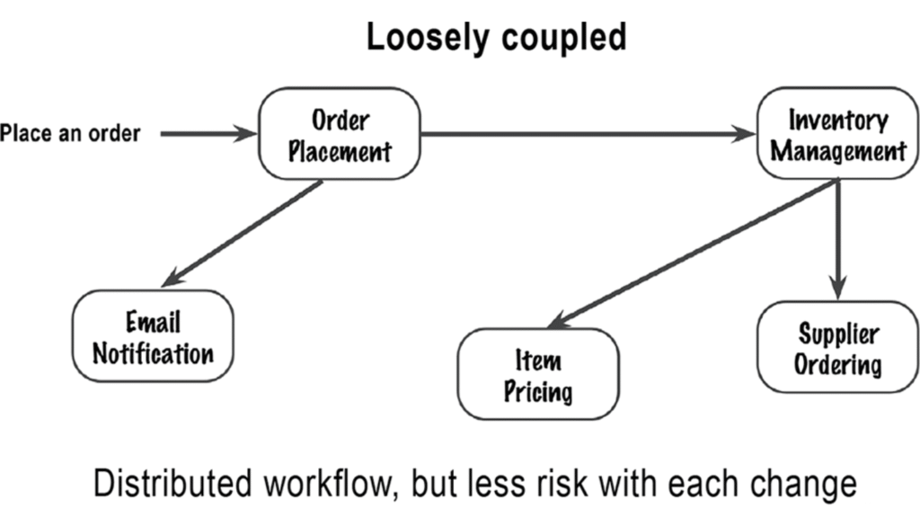 در مقابل، معماری با اتصال ضعیف (Loosely Coupled) دانش رو بین چند کامپوننت پخش میکنه، طوری که هیچ کامپوننتی همهی مراحل رو نمیدونه.