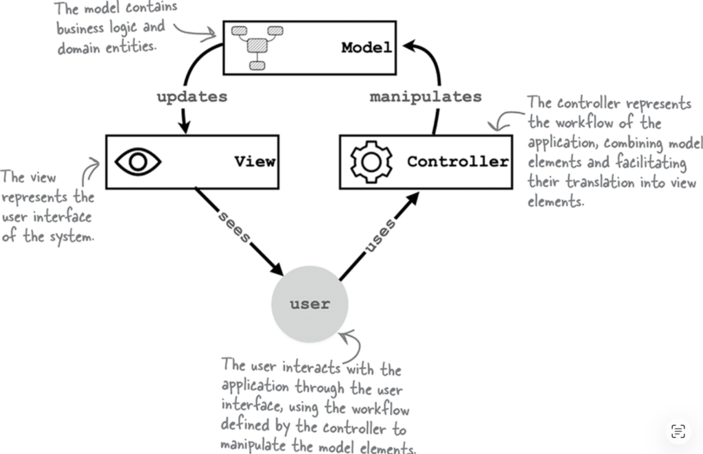 برای توضیح مفهوم الگوهای طراحی، کتاب تأثیرگذار Head First Design Patterns از الگوی طراحی Model-View-Controller (MVC) استفاده میکنه—که قابلیتها رو بر اساس هدفشون از هم جدا میکنه.