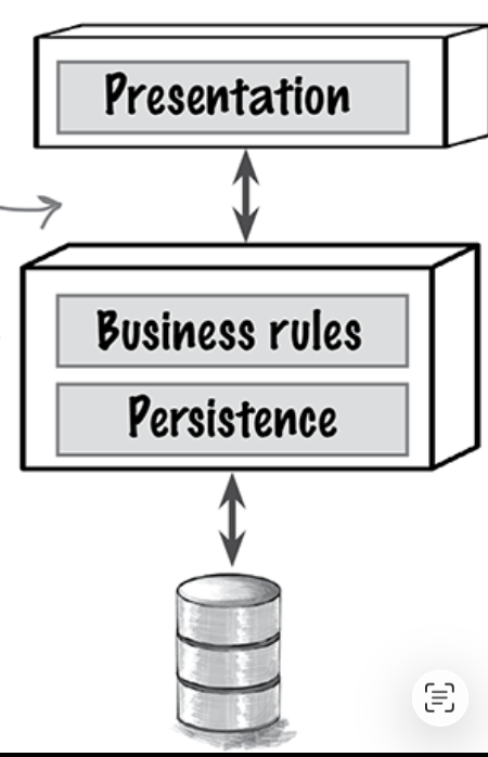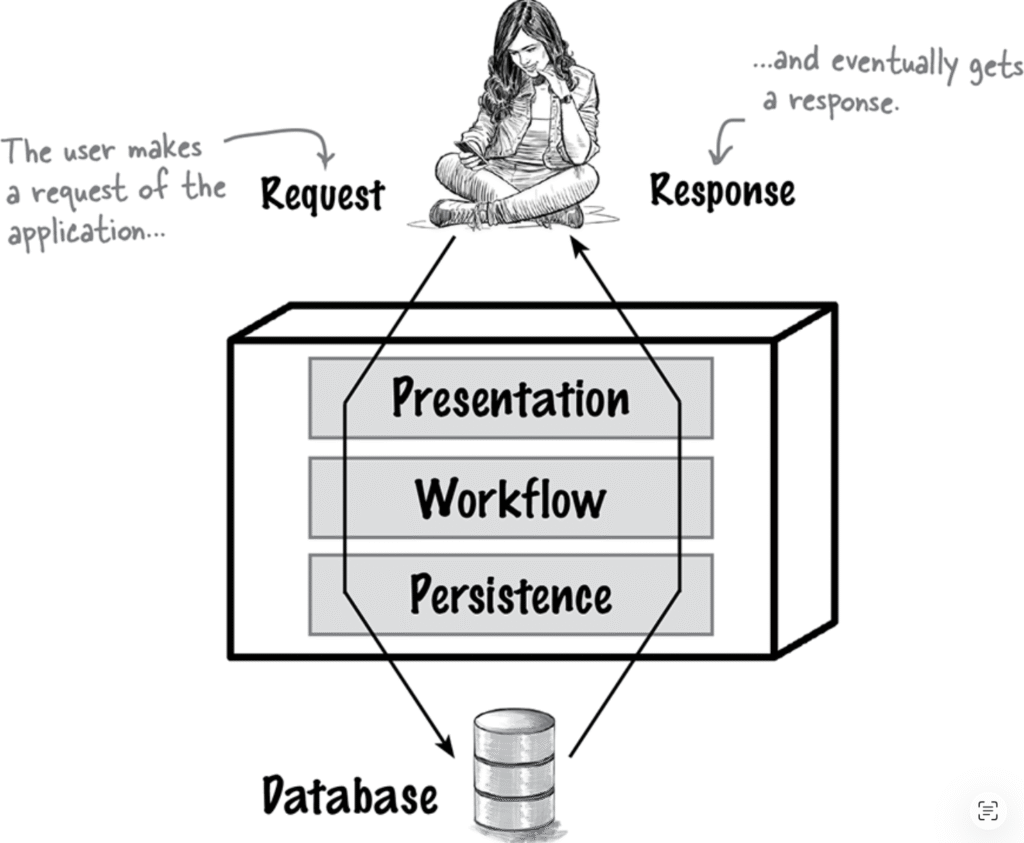 توی یه معماری لایهای یکپارچه (monolithic)، وقتی کاربر از سیستم چیزی میخواد، رابط کاربری (UI) اون درخواست رو شروع میکنه. بعد، این درخواست از هر لایهی معماری عبور میکنه. اگه نیاز به ذخیرهسازی در پایگاه داده باشه، درخواست از بالا به پایین میره—و بعد مسیر برگشت رو طی میکنه تا پاسخ به کاربر برسه.