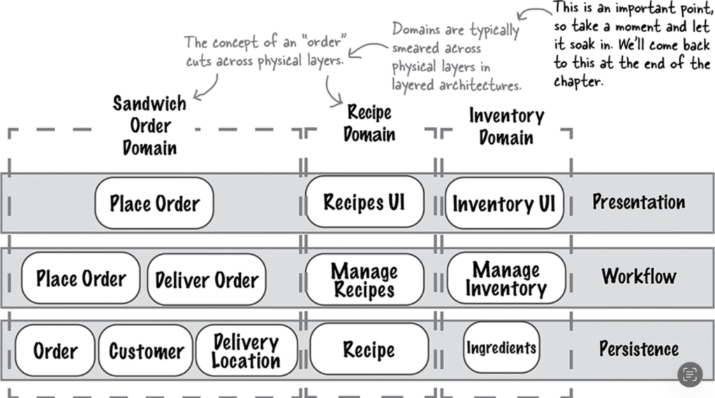 توانایی تغییر دادن اجزا بهصورت ایزوله، قدرت ویژهی معماری لایهایه—اما این معماری گلولهی جادویی نیست. مصالحهی بزرگ این سبک معماری اینه که دامنهی مسئله در سراسر لایهها پخش شده. برای مثال، کامپوننت منطقی «ثبت سفارش» در معماری «نان و پاپ» نیاز به رابط کاربری (presentation)، کدی برای پیادهسازی جریان کاری (workflow)، و یک شِمای داده (persistence) داره.