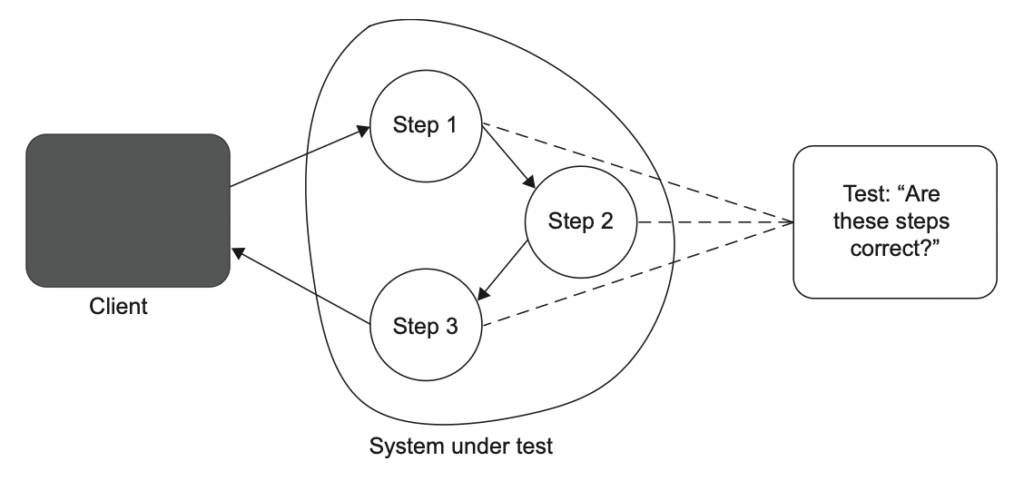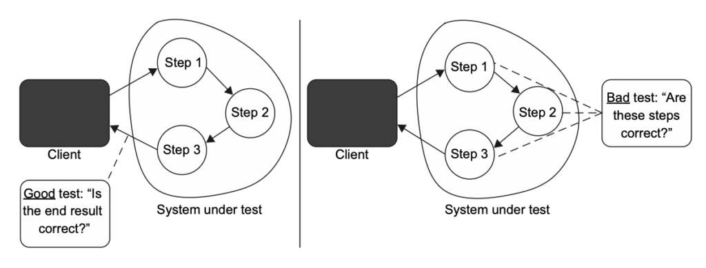 با این حال، تست در هر کدوم از این تغییرات fail میشه، حتی وقتی نتیجهی نهایی تغییر نکرده باشه. دلیلش اینه که تست به جزئیات پیادهسازی SUT وابستهست، نه به خروجیای که SUT تولید میکنه. این تست الگوریتم رو بررسی میکنه و انتظار داره یک پیادهسازی خاص رو ببینه، بدون اینکه به پیادهسازیهای جایگزین که به همون اندازه درست هستن توجهی داشته باشه.