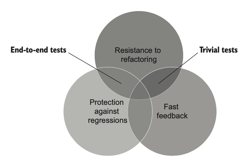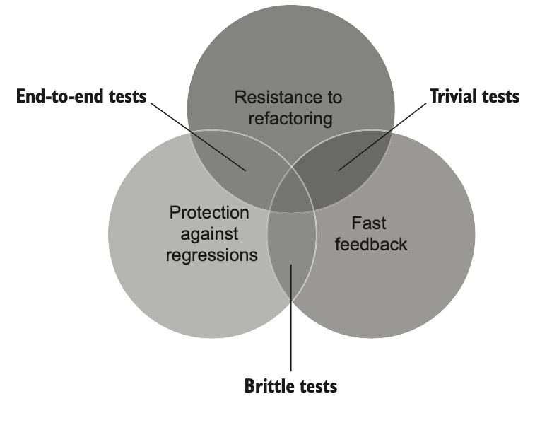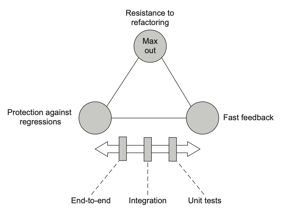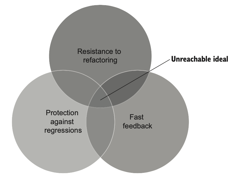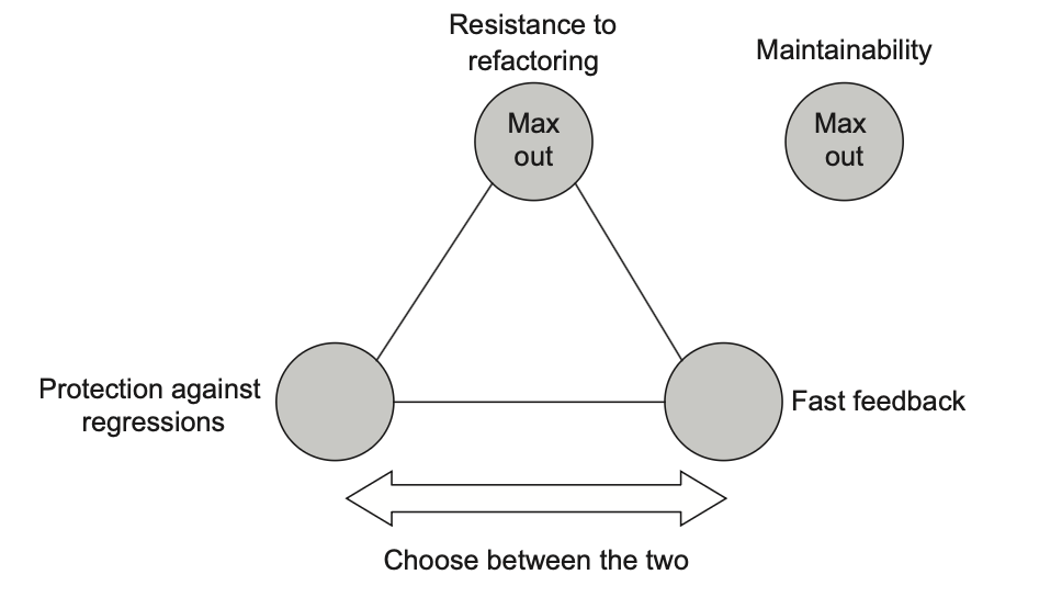 - ایجاد تستی که در هر چهار ویژگی امتیاز کامل بگیره غیرممکنه، چون سه ویژگی اول—محافظت در برابر regression، مقاومت در برابر بازآرایی و بازخورد سریع—متناقض هستن. تست فقط میتونه دو تا از این سه رو به حداکثر برسونه.