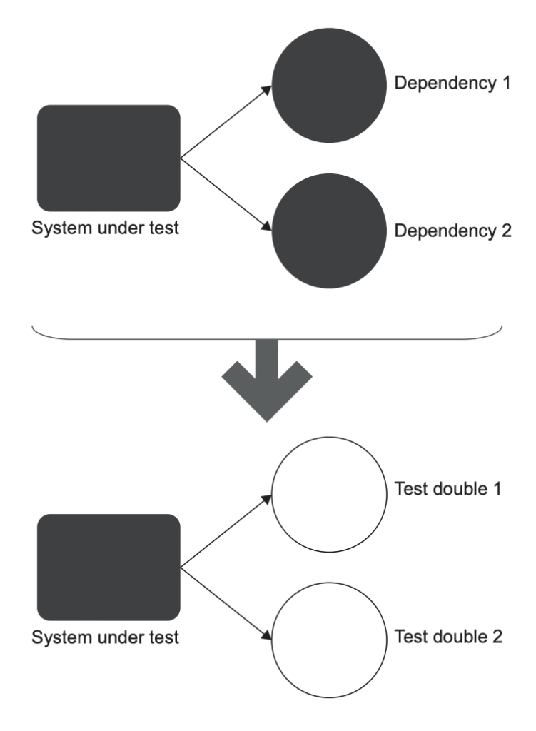 شکل ۲.۱ نشون میده که ایزولهسازی معمولاً چطور انجام میشه. تستی که در حالت عادی قراره سیستم تحت تست رو همراه با همهی وابستگیهاش بررسی کنه، حالا میتونه این کار رو جدا از اون وابستگیها انجام بده.