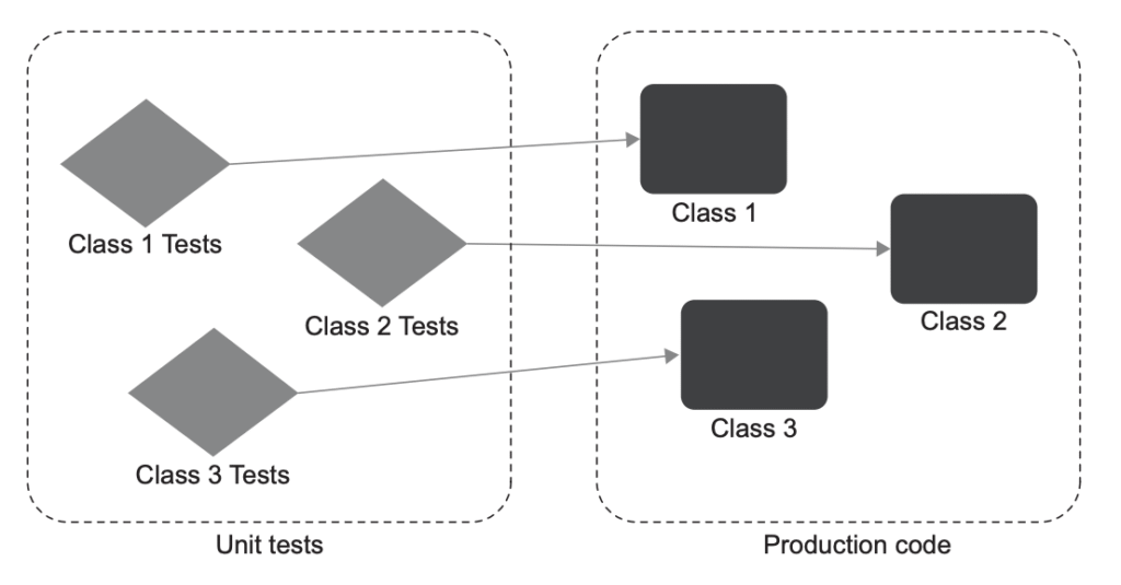 و یه نکتهی کوچیک ولی خوشایند دیگه از این رویکرد ایزولهسازی: میتونی یه قانون سادهی سراسری برای پروژه تعریف کنی: هر بار فقط یه کلاس رو تست کن. این باعث میشه ساختار مجموعه تستهات ساده و قابلپیشبینی بشه. دیگه لازم نیست زیاد فکر کنی که چطور باید پایگاه کدت رو با تست پوشش بدی. یه کلاس داری؟ یه کلاس تست براش بساز! شکل ۲.۲ نشون میده که این ساختار معمولاً چه شکلیه.