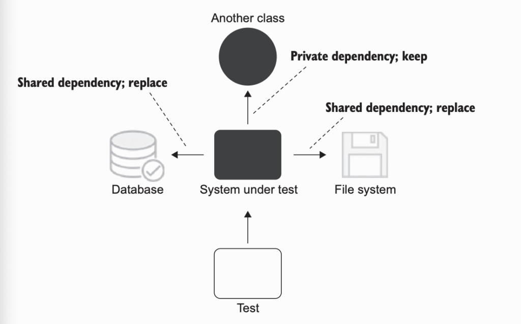 دقت کن که وابستگی مشترک، بین تستهای واحد مشترکه، نه بین کلاسهای تحت تست. از این منظر، یه وابستگی singleton لزوماً مشترک محسوب نمیشه – بهشرطی که توی هر تست بتونی یه نمونهی جدید ازش بسازی. درسته که توی کد تولیدی فقط یه نمونه از singleton وجود داره، اما تستها لزوماً مجبور نیستن از همون الگو پیروی کنن یا اون singleton رو بازاستفاده کنن. در نتیجه، چنین وابستگیای توی تستها خصوصی (private) حساب میشه، چون بین تستها به اشتراک گذاشته نشده.