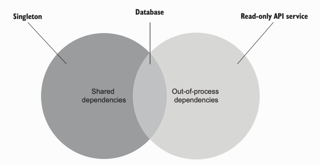 وابستگیایه که خارج از فرآیند اجرایی اپلیکیشن اجرا میشه—در واقع یه واسطهست برای دادههایی که هنوز وارد حافظهی برنامه نشدن. بیشتر وقتها، وابستگیهای خارج از فرآیند، وابستگیهای مشترک هم هستن؛ اما نه همیشه. مثلاً پایگاه داده هم خارج از فرآینده و هم مشترک. ولی اگه قبل از هر اجرای تست، اون پایگاه داده رو توی یه کانتینر Docker راهاندازی کنی، اون وابستگی دیگه مشترک نیست—چون تستها دیگه با یه نمونهی واحد کار نمیکنن. بهطور مشابه، یه پایگاه دادهی فقطخواندنی هم خارج از فرآینده ولی مشترک نیست، حتی اگه بین تستها باز استفاده بشه—چون تستها نمیتونن دادههاش رو تغییر بدن و بنابراین نمیتونن روی نتیجهی همدیگه تأثیر بذارن.