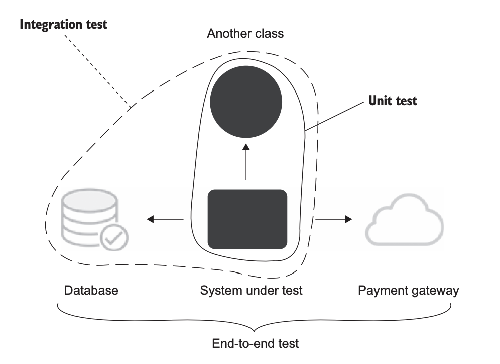 توی یه تست یکپارچهی معمولی، فقط دیتابیس و سیستم فایل داخل محدودهی تست قرار میگیرن، و برای درگاه پرداخت از یه test double استفاده میکنی. دلیلش اینه که روی دیتابیس و سیستم فایل کنترل کامل داری، و میتونی راحت اونها رو به وضعیت مورد نیاز برای تست برسونی.